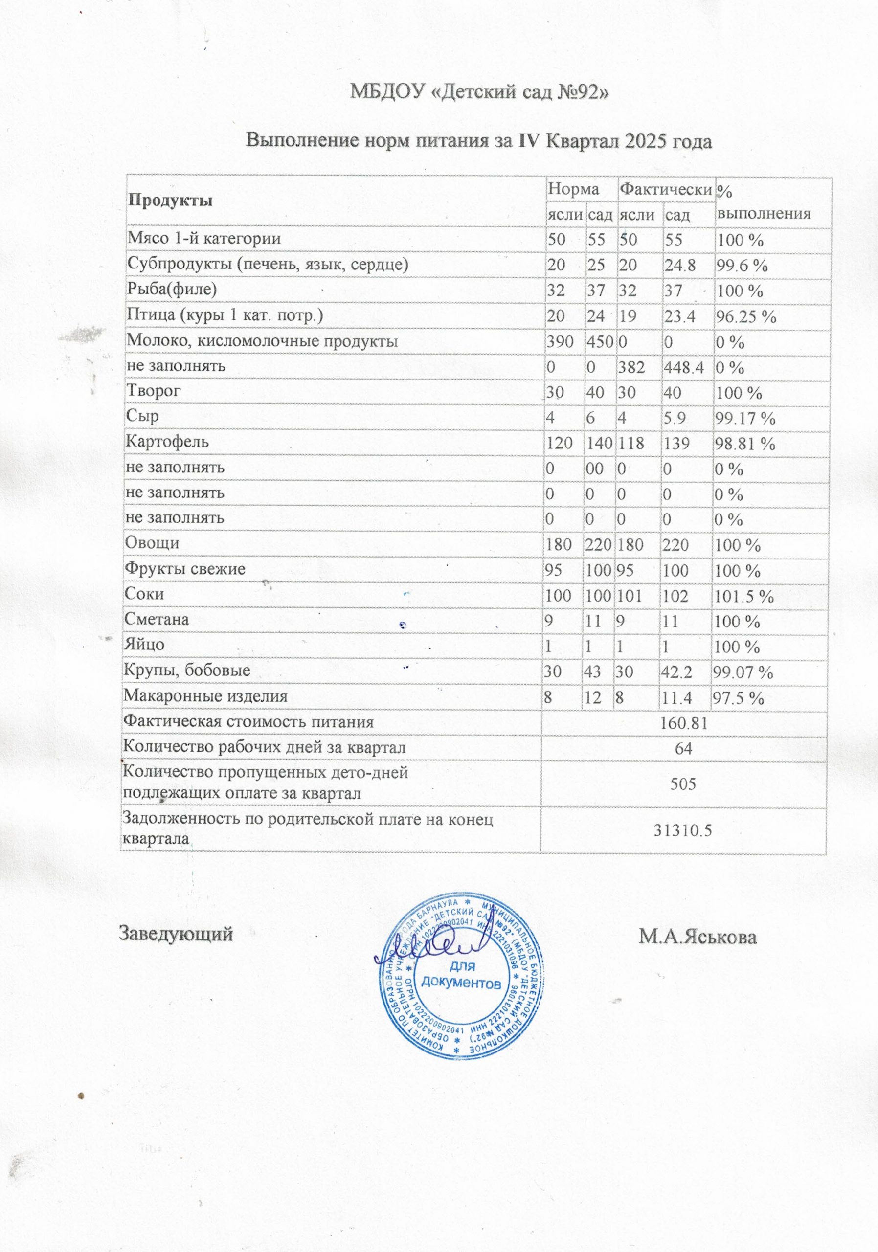 Выполнение норм питания за 4 кв 2024 год